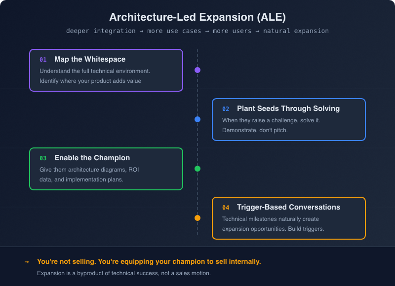 ALE isn’t passive. It’s proactive problem-solving that creates natural pull. You’re solving problems, demonstrating capabilities, and equipping champions. The expansion conversation is a consequence of excellent technical partnership, not an agenda item you’re avoiding.