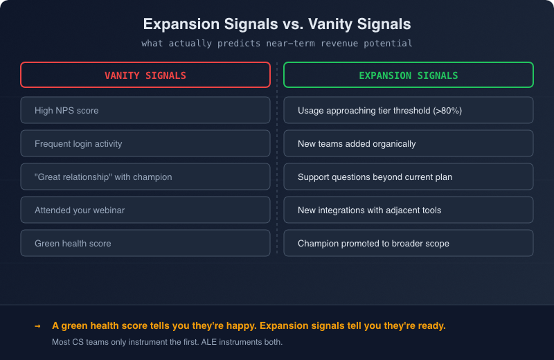 The distinction between vanity signals and real expansion signals is critical. A green health score tells you the customer is happy. Expansion signals tell you they’re ready. Most CS teams only instrument the first metric. ALE requires you to instrument both.
