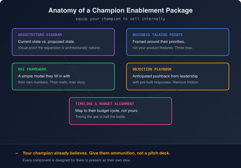 The Champion Enablement Package is the most underused tool in CS. Instead of you selling to their leadership, you equip your champion to make the case internally. This works for three reasons: