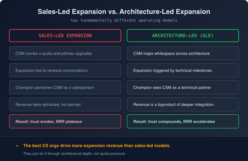 I’ve watched this scenario play out at dozens of companies. The teams that grafted sales motions onto CS relationships saw an initial bump in expansion revenue followed by a slow, steady decline in NRR. Teams that took a different approach, one rooted in technical depth, consistently outperformed.