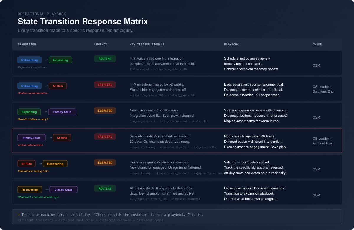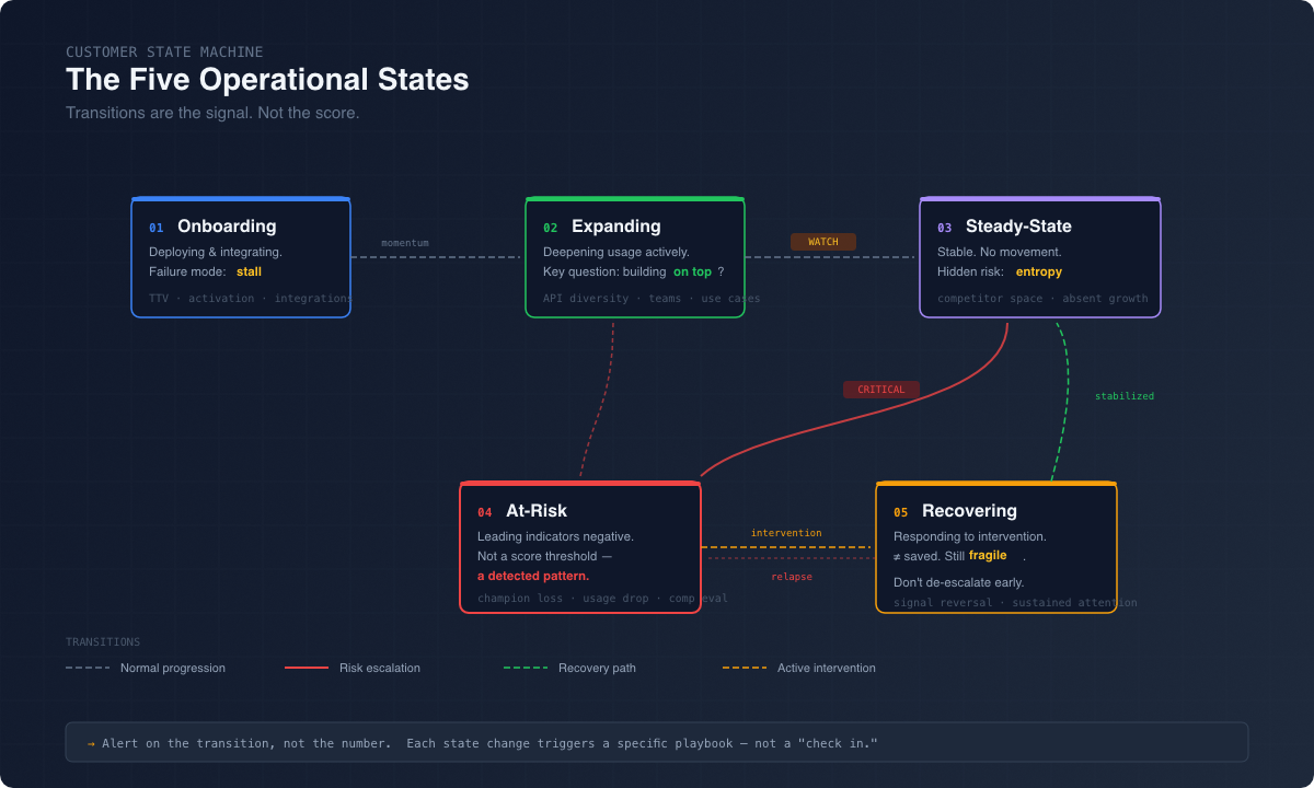The thing that matters isn’t the state itself. It’s the transitions. When a customer moves from Expanding to Steady-State, that means something. When they slide from Steady-State to At-Risk, that’s not a yellow dashboard. That’s a fire drill with a specific playbook attached to it.