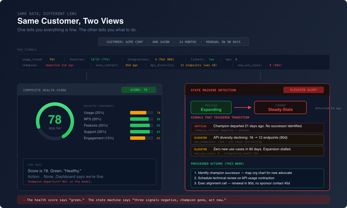 Health scores were built for a world where CS was an account management function and the main event was a quarterly business review. If you’re running CS for a technical product, where your customers are engineers, your value lives in their architecture, and retention comes down to integration depth, you need something that thinks in states and transitions, not weighted averages.